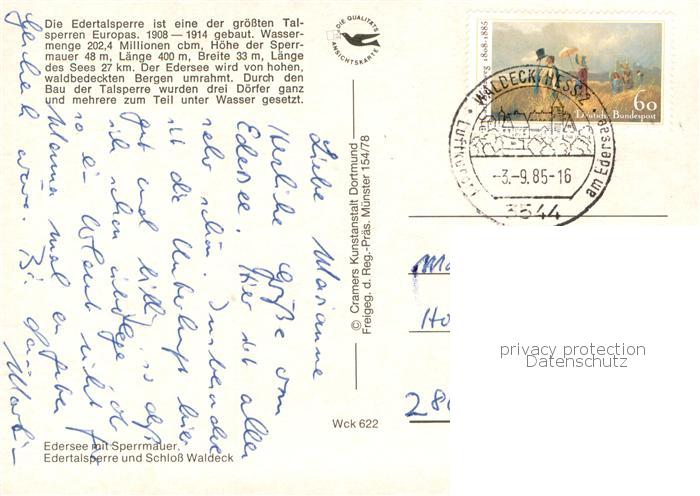 73781181 alte Postkarte Edersee Fliegeraufnahme mit Edertalsperre postalisch gelaufen Erhaltung siehe scans [FriedD77] KatCode: 11110006635009