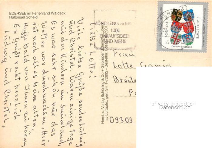 73320978 alte Postkarte Edersee Fliegeraufnahme mit Halbinsel Scheid postalisch gelaufen Erhaltung siehe scans [WerneD78] KatCode: 11110006635009