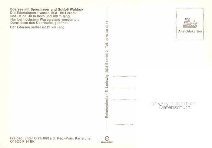 72792230 Edersee Fliegeraufnahme mit Sperrmauer und Schloss Waldeck postalisch nicht gelaufen Erhaltung siehe scans [LiesaD40] KatCode: 11110006635009