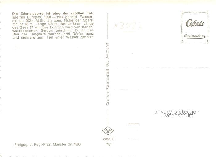 73176980 Edersee Fliegeraufnahme Sperrmauer Schloss Waldeck postalisch nicht gelaufen Erhaltung siehe scans [NatalD47] KatCode: 11110006635009