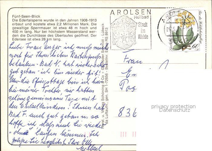 72590707 alte Postkarte Edersee Fuenf Seen Blick Edertalsperre Fliegeraufnahme postalisch gelaufen Erhaltung siehe scans [WerneD78] KatCode: 11110006635009