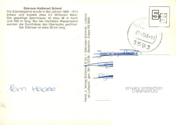 73219191 alte Postkarte Edersee Halbinsel Scheid Edertalsperre Fliegeraufnahme postalisch gelaufen Erhaltung siehe scans [FriedD77] KatCode: 11110006635009