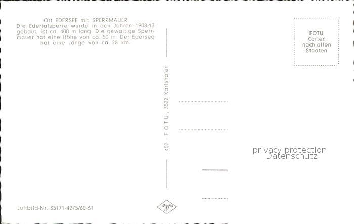 71903176 Edersee mit Sperrmauer Edertalsperre Fliegeraufnahme postalisch nicht gelaufen Erhaltung siehe scans KatCode: 11110006635009
