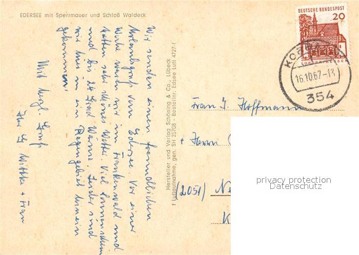 73106593 alte Postkarte Edersee Sperrmauer Schloss Waldeck postalisch gelaufen Erhaltung siehe scans [KathaD81] KatCode: 11110006635009