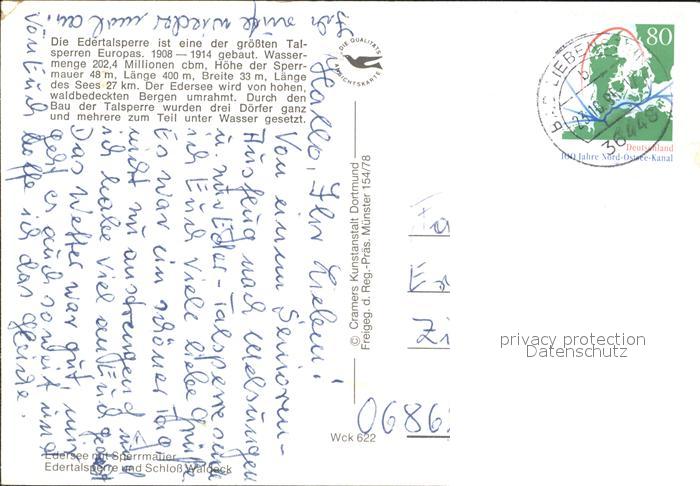 72390873 alte Postkarte Edertal Edetalsperre postalisch gelaufen Erhaltung siehe scans KatCode: 11110006635009
