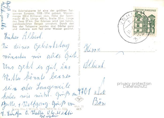 73108832 alte Postkarte Edertalsperre Fliegeraufnahme postalisch gelaufen Erhaltung siehe scans [WerneD78] KatCode: 11110006635009