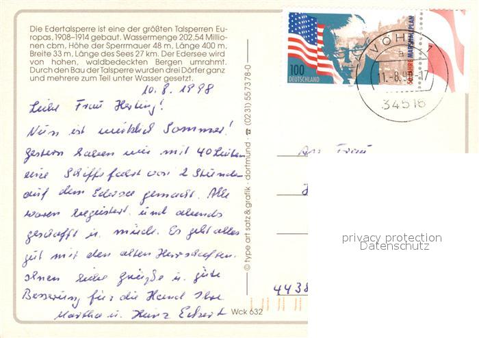 73322123 alte Postkarte Edertalsperre Fliegeraufnahme postalisch gelaufen Erhaltung siehe scans [KathaD81] KatCode: 11110006635009