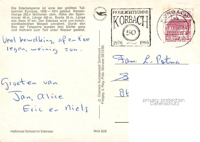 73313751 alte Postkarte Edertalsperre Fliegeraufnahme postalisch gelaufen Erhaltung siehe scans [LiesaD40] KatCode: 11110006635009