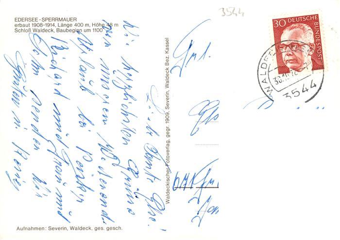 73933313 Edertalsperre Sperrmauer Ederseepartien Schloss Waldeck postalisch gelaufen Erhaltung siehe scans [WerneD78] alte Postkarte Wern Katcode 11110006635009