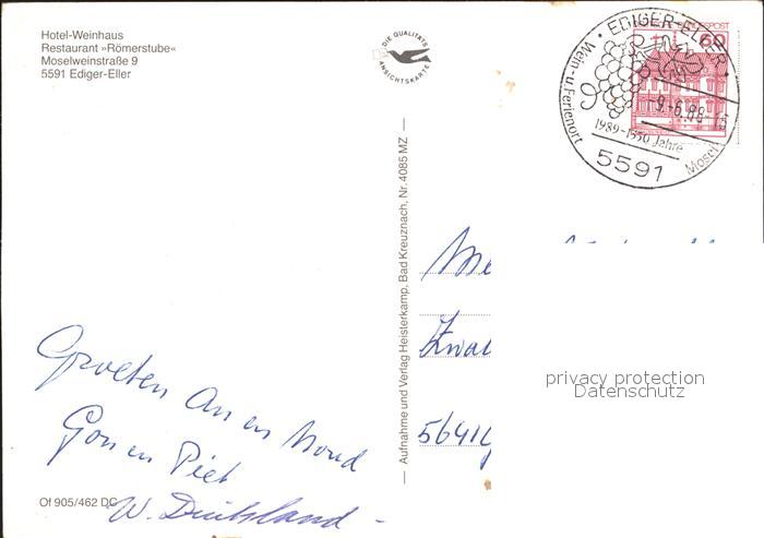 72921162 alte Postkarte Ediger-Eller Hotel- Weinhaus Restaurant Roemerstube postalisch gelaufen Erhaltung siehe scans [MatthD68] KatCode: 11110007135024