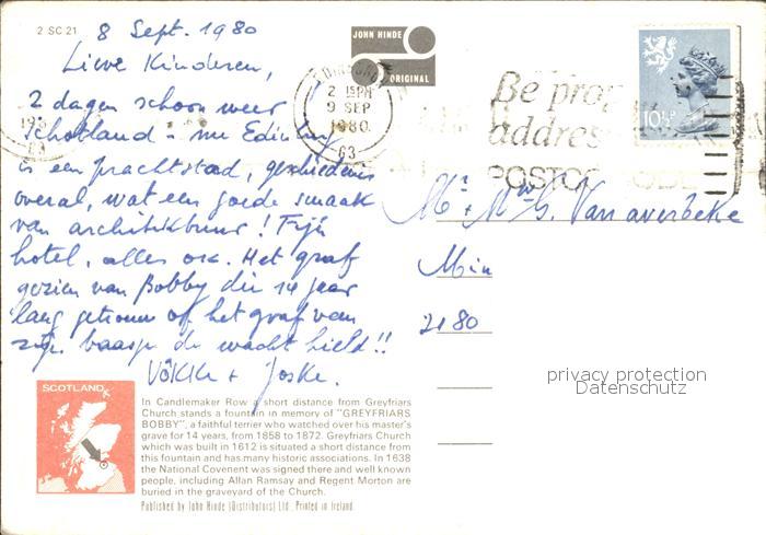 old postcard Edinburgh Scotland Creyfrias Bobby Candlemaker postalisch gelaufen Erhaltung siehe scans