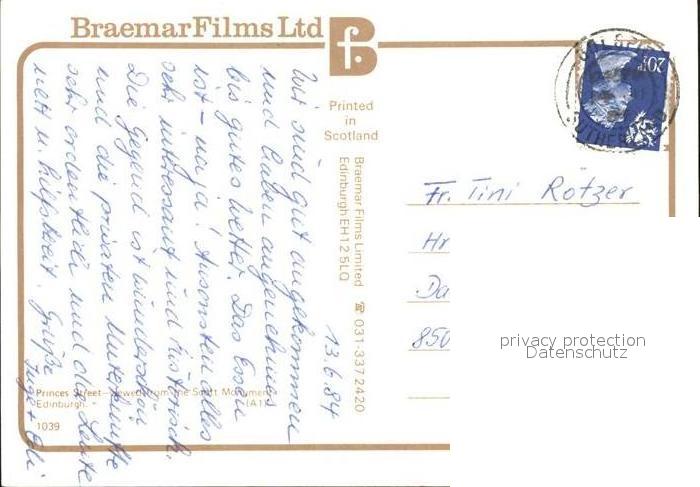 old postcard Edingburgh Grossbritannien Princess Street postalisch gelaufen Erhaltung siehe scans