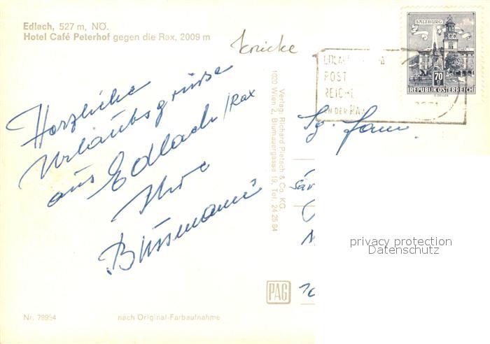 73089160 alte Postkarte Edlach Hotel-Cafe Peterhof Rax postalisch gelaufen Erhaltung siehe scans [PaolaD17] KatCode: 11390