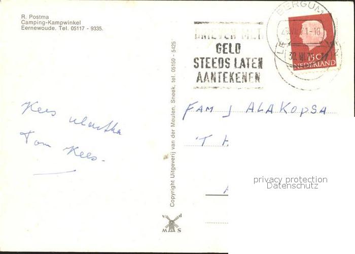 old postcard Eernewoude Camping Kampwinkel Wasserstrasse Segelboot postalisch gelaufen Erhaltung siehe scans