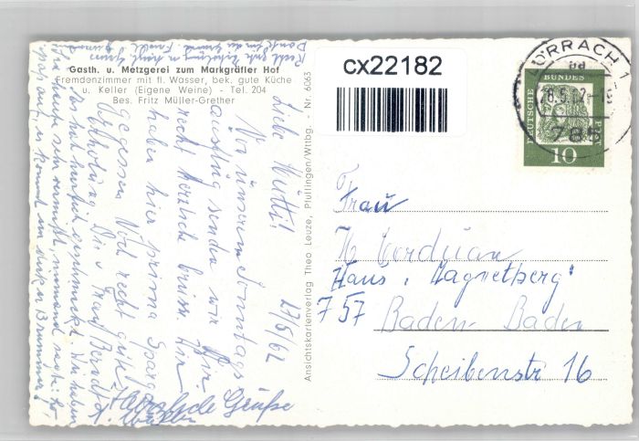 30739474 alte Postkarte Efringen-Kirchen Gasthaus Markgraefler Hof postalisch gelaufen KatCode: 11110008336014