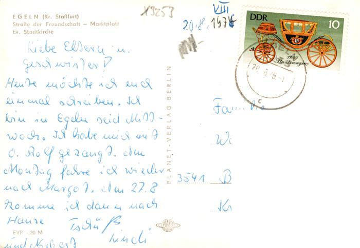 73887321 alte Postkarte Egeln Strasse der Freundschaft Marktplatz Ev Stadtkirche postalisch gelaufen Erhaltung siehe scans [FriedD77] KatCode: 11110015089075