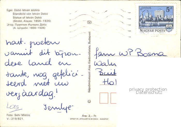 old postcard Eger Ungarn Standbild von Istvan Dobo postalisch gelaufen Erhaltung siehe scans