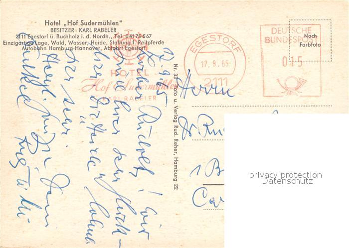 73662219 alte Postkarte Egestorf Nordheide Hotel Hof Sudermuehlen Reitstall Teich Lueneburger Heide postalisch gelaufen Erhaltung siehe scans [FriedD77] KatCode: 11110003353009