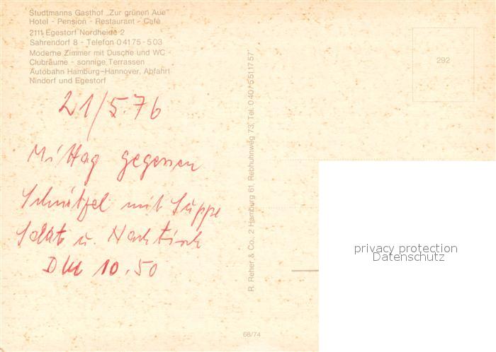 73723596 Egestorf Nordheide Studtmanns Gasthof Zur gruenen Aue Hotel Pension Restaurant Cafe Heidelandschaft postalisch nicht gelaufen Erhaltung siehe scans [FriedD77] KatCode: 11110003353009