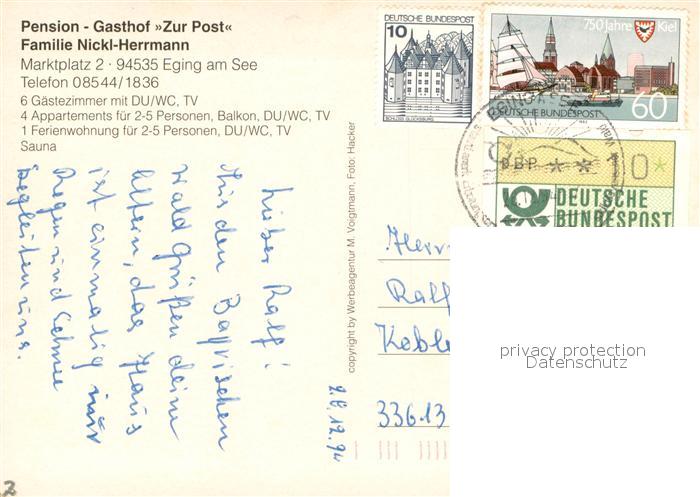 73727201 alte Postkarte Eging See Pension Gasthof Zur Post Restaurant Fremdenzimmer postalisch gelaufen Erhaltung siehe scans [FriedD77] KatCode: 11110009275120