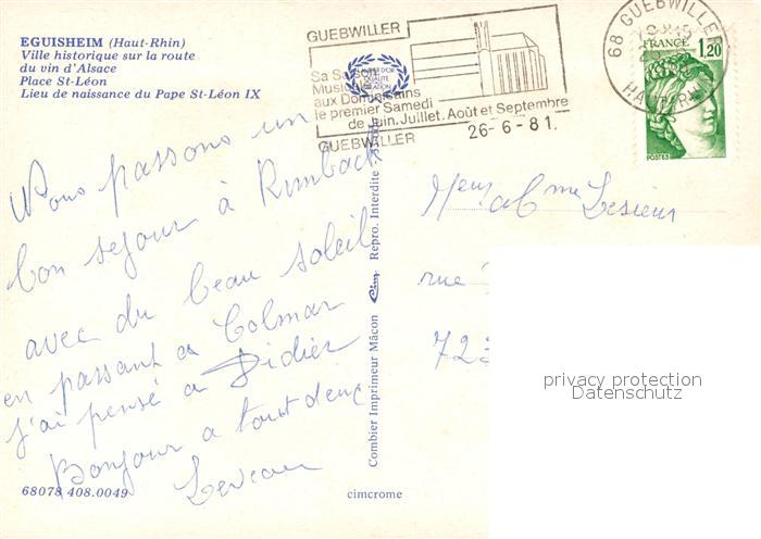 13593816 Eguisheim Haut Rhin Place St Leon Lieu de naissance du Pape St Leon IX postalisch gelaufen Erhaltung siehe scans [WerneD78] carte postale Wern Katcode 11170068268078