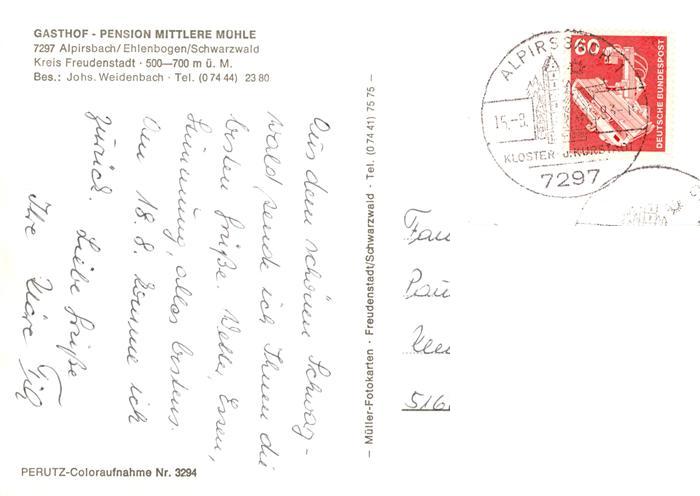 73884195 alte Postkarte Ehlenbogen Alpirsbach Gasthof Pension Mittlere Muehle Gastraum postalisch gelaufen Erhaltung siehe scans [FriedD77] KatCode: 11110008237002