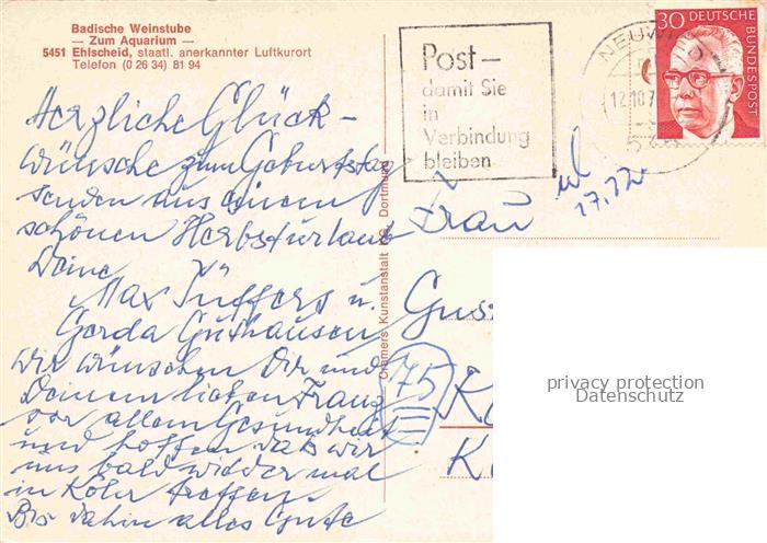 74050309 alte Postkarte Ehlscheid Badische Weinstube Zum Aquarium postalisch gelaufen Erhaltung siehe scans [WerneD78] KatCode: 11110007138015