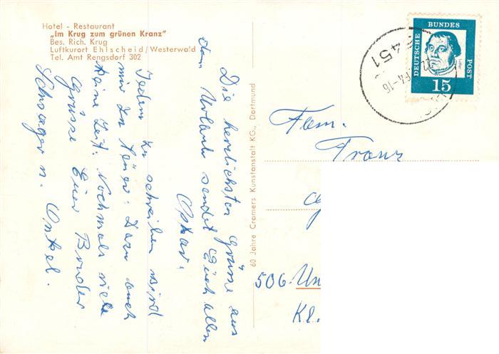 73874300 alte Postkarte Ehlscheid Hotel Restaurant Im Krug zum gruenen Kranz Fachwerkhaus postalisch gelaufen Erhaltung siehe scans [FriedD77] KatCode: 11110007138015