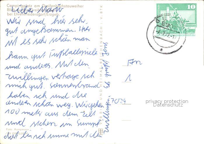 72110929 alte Postkarte Ehrenfriedersdorf Erzgebirge Camping am Greifenbachstauweiher postalisch gelaufen KatCode: 11110014171080