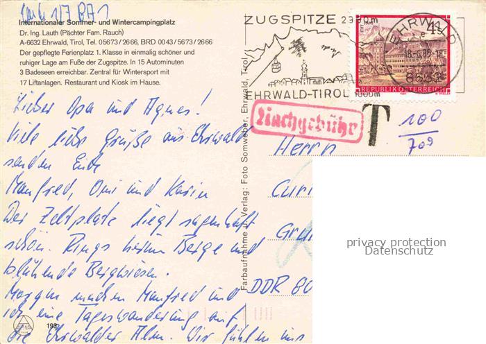 74037949 alte Postkarte Ehrwald Tirol AT Sommer- und Wintercampingplatz Gaestehaus Gaststube Zugspitze Wettersteingebirge postalisch gelaufen Erhaltung siehe scans [FriedD77] KatCode: 11390331070807