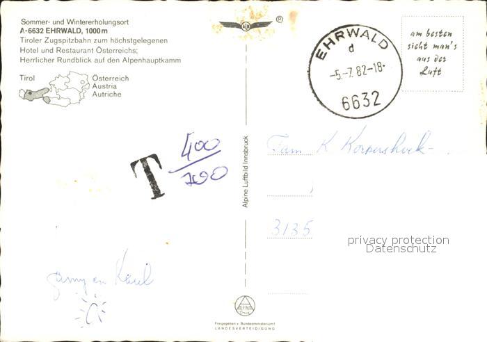 72460754 alte Postkarte Ehrwald Tirol mit Zugspitze Fliegeraufnahme postalisch gelaufen Erhaltung siehe scans KatCode: 11390331070807