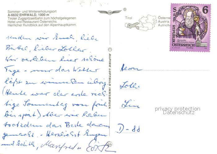 73363583 alte Postkarte Ehrwald Tirol mit Zugspitze Wettersteingebirge Fliegeraufnahme postalisch gelaufen Erhaltung siehe scans [FriedD77] KatCode: 11390331070807