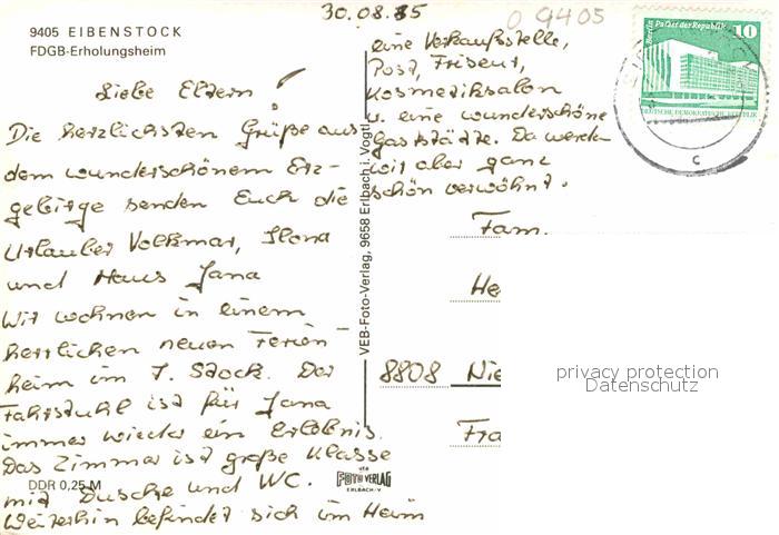 72925198 alte Postkarte Eibenstock FDGB Erholungsheim postalisch gelaufen Erhaltung siehe scans [WerneD78] KatCode: 11110014191120