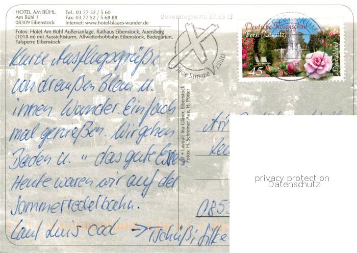 73645505 alte Postkarte Eibenstock Hotel am Buehl Rathaus Auersberg mit Aussichtsturm Bobbahn Badegarten Talsperre Eibenstock postalisch gelaufen Erhaltung siehe scans [WerneD78] KatCode: 11110014191120