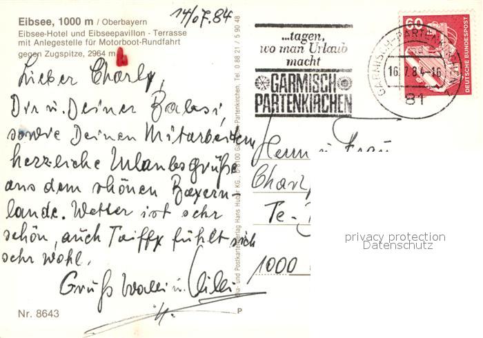 72966934 alte Postkarte Eibsee Eibseehotel mit Pavillon Terrasse postalisch gelaufen Erhaltung siehe scans [LiesaD40] KatCode: 11110009180118