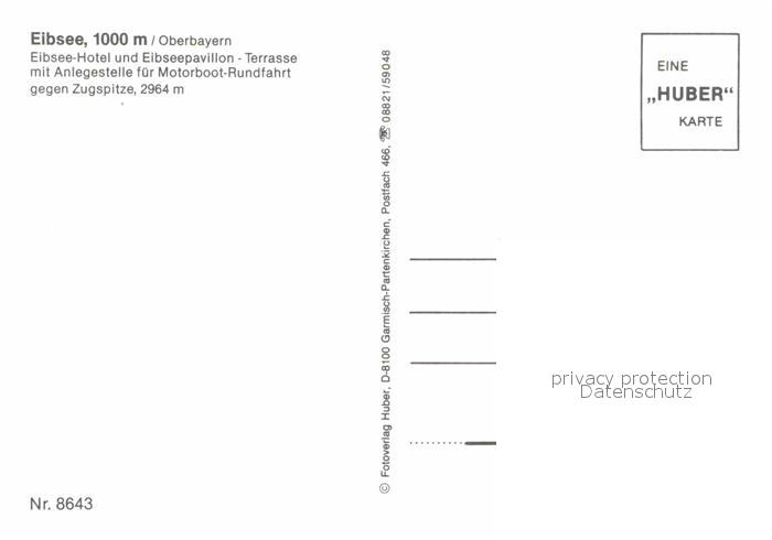 72707029 Eibsee Hotel Eibseepavillon Terrasse Motorboot Rundfahrt Zugspitze Wettersteingebirge Huber Karte Nr 8643 postalisch nicht gelaufen Erhaltung siehe scans [FriedD77] KatCode: 11110009180118