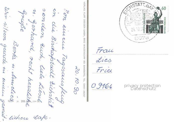 72641485 alte Postkarte Eichstaett Oberbayern Bischofsstadt Willibaldsburg Dom St Walburg Jurasteinbruechen Wittelsbacher Brunnen Bischoefliche Sommerresidenz postalisch gelaufen Erhaltung siehe scans [FriedD77] KatCode: 11110009176123