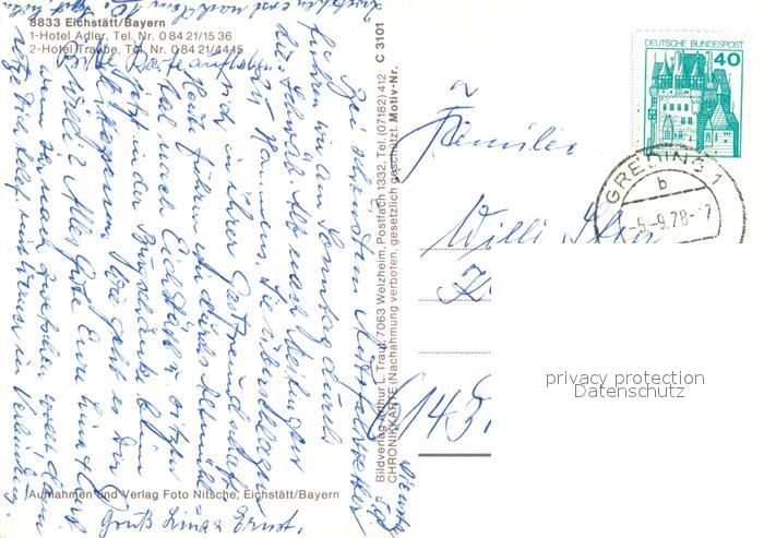 73182530 alte Postkarte Eichstaett Oberbayern Dom Westfassade Willibaldsburg Residenzplatz Marktplatz Fliegeraufnahme Chronik Wappen postalisch gelaufen Erhaltung siehe scans [FriedD77] KatCode: 11110009176123
