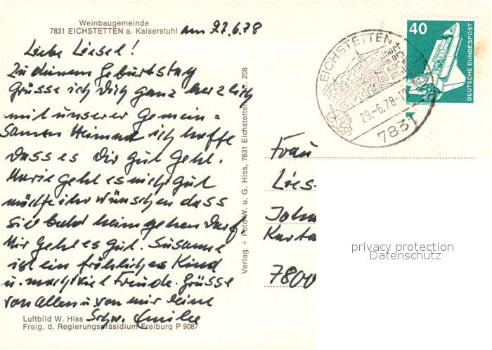 73600131 alte Postkarte Eichstetten Kaiserstuhl Weinbaugemeinde Fliegeraufnahme postalisch gelaufen Erhaltung siehe scans [FriedD77] KatCode: 11110008315030