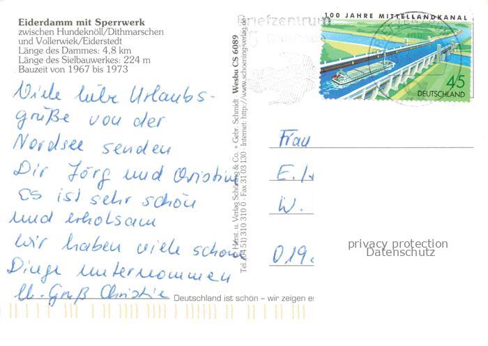 74143721 alte Postkarte Eidersperrwerk Wesselburenerkoog Schleswig-Holstein Hundeknoell Dithmarschen postalisch gelaufen Erhaltung siehe scans [SanaeD93] KatCode: 11110001051129