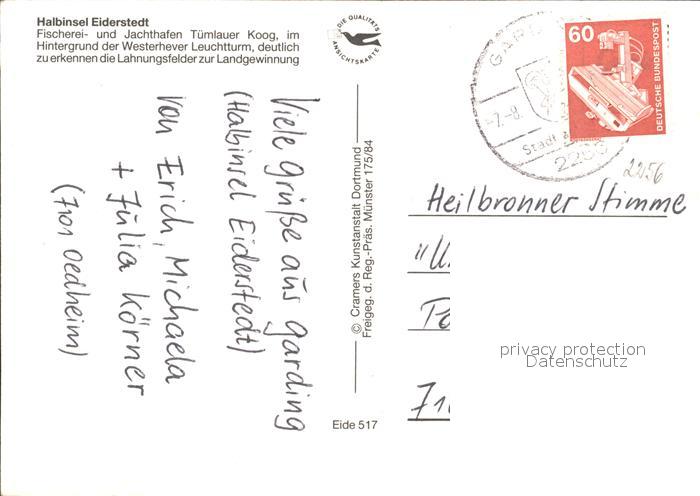 72011938 alte Postkarte Eiderstedt Fischerei- und Jachthafen Tuemlauer Koog postalisch gelaufen Erhaltung siehe scans KatCode: 11110001054138