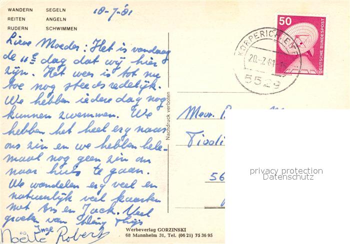 73306113 alte Postkarte Eifel Region Naturpark Suedeifel Wandern Reiten Segeln Schwimmbad postalisch gelaufen Erhaltung siehe scans [WerneD78] KatCode: 11110007141121
