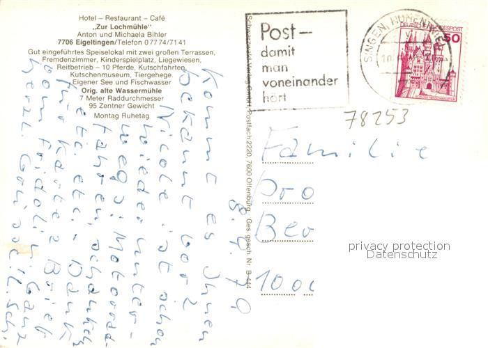 73600077 alte Postkarte Eigeltingen Hotel Restaurant Cafe Zur Lochmuehle Kutschfahrten Reiten Wassermuehle postalisch gelaufen Erhaltung siehe scans [FriedD77] KatCode: 11110008335021