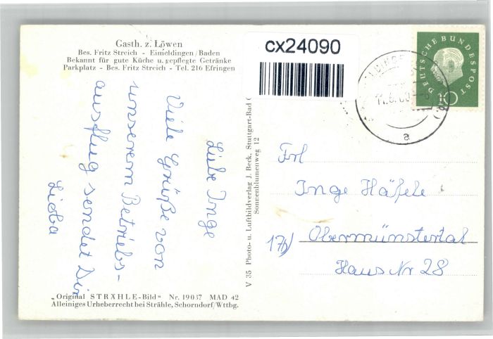 30752822 alte Postkarte Eimeldingen Gasthaus Loewen postalisch gelaufen KatCode: 11110008336019