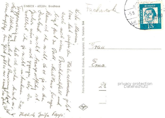 72942585 alte Postkarte Einbeck Niedersachsen Brodhaus Fachwerk postalisch gelaufen Erhaltung siehe scans [LiesaD40] KatCode: 11110003155004