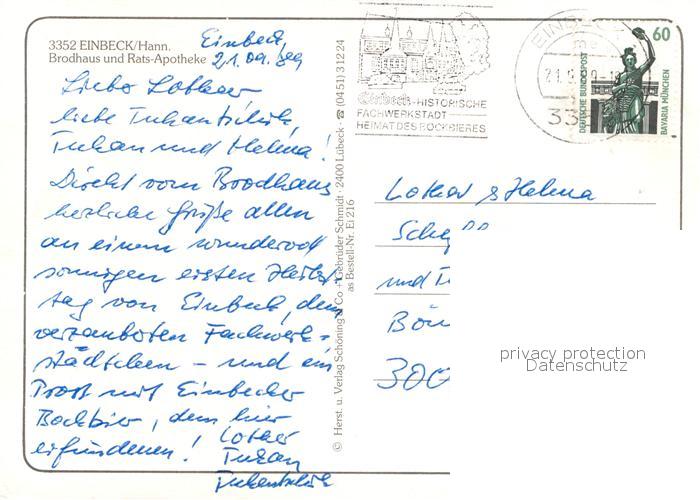 72935347 alte Postkarte Einbeck Niedersachsen Brodhaus und Rats Apotheke postalisch gelaufen Erhaltung siehe scans [WerneD78] KatCode: 11110003155004