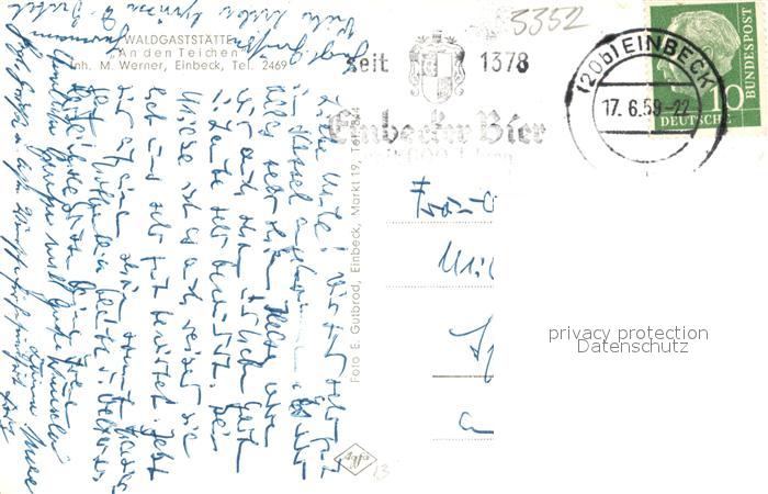 43349904 alte Postkarte Einbeck Niedersachsen Waldgaststaette An den Teichen Schwanenteich postalisch gelaufen Erhaltung siehe scans [FriedD77] KatCode: 11110003155004