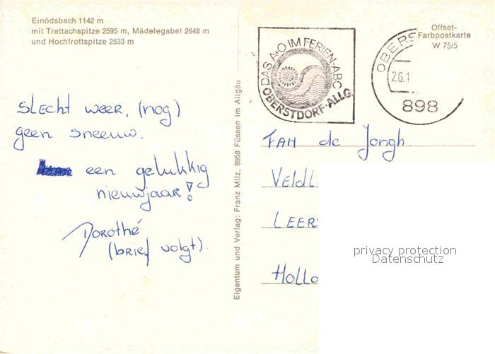 72845278 alte Postkarte Einoedsbach Trettachspitze Maedelegabel Hochfrottspitze Kapelle postalisch gelaufen Erhaltung siehe scans [NatalD47] KatCode: 11110009780133