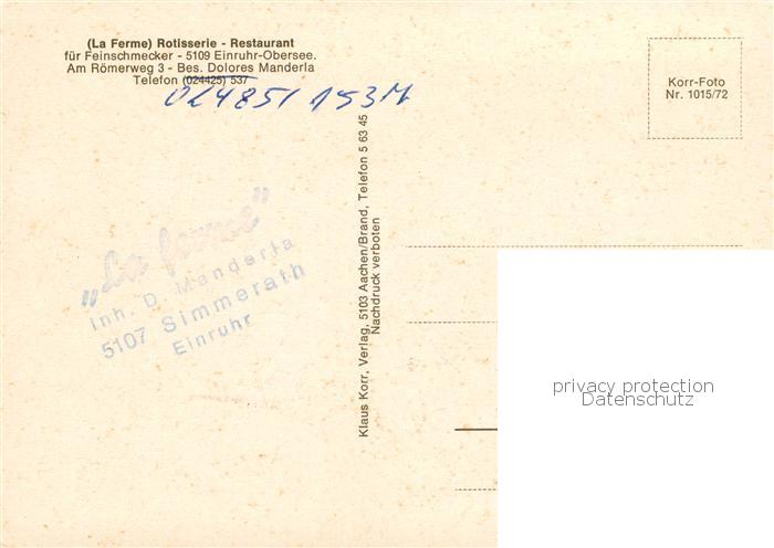 73845855 Einruhr Simmerath La Ferme Rotisserie Restaurant postalisch nicht gelaufen Erhaltung siehe scans [FriedD77] KatCode: 11110005354028