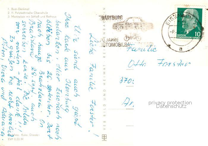 73062306 alte Postkarte Eisenach Thueringen Bach Denkmal Statue Polytechnische Oberschule Marktplatz Schloss Rathaus postalisch gelaufen Erhaltung siehe scans [FriedD77] KatCode: 11110016056000